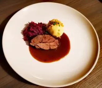 Wildschweinbraten mit Apfelrotkraut und Erdäpfelknödeln
