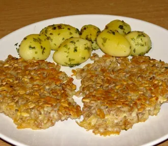 Schweinskotelett gebacken mit Petersilerdäpfeln & Rahm Gurkensalat