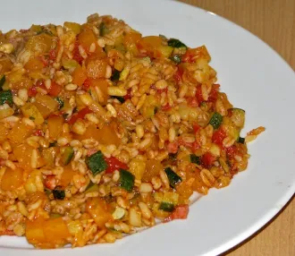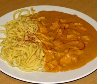 Schweinsrouladen mit Wurzel-Rahmsauce, Reis & Gurkensalat