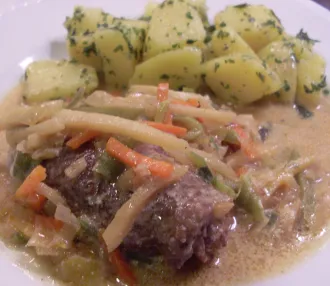 Fleischpalatschinken & Kochsalat mit Erbsen