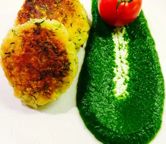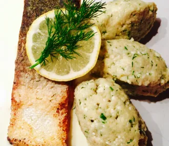 Dill-Topfennockerl auf Käse-Sahne Sauce