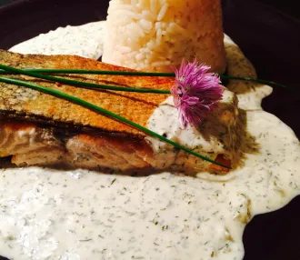 Dill-Sahne Sauce/Lachsfilet/Butterreis