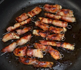 Hendl-Häppchen im Speckhemd mit Knoblauch-Dip