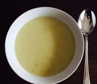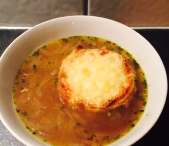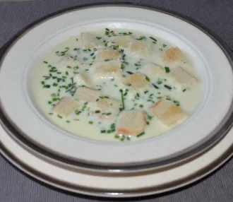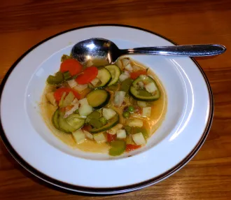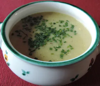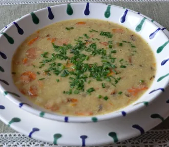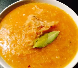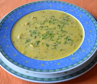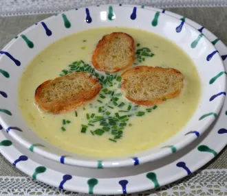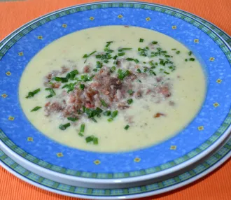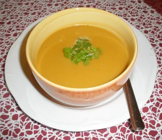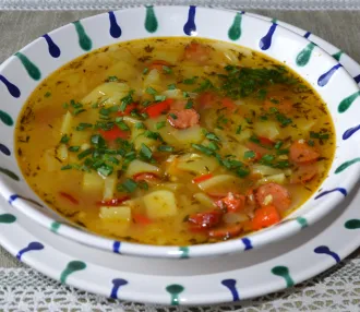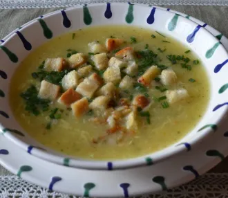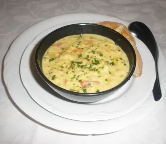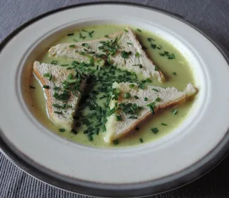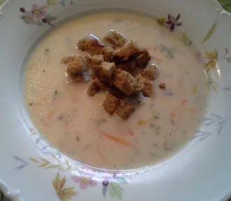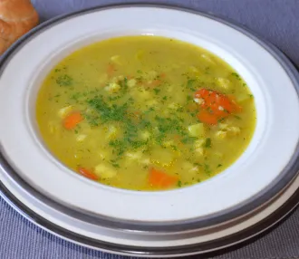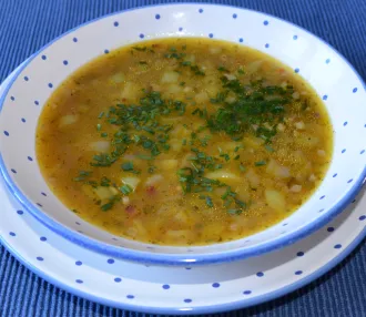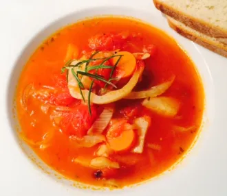 Paprika-Kartoffelsuppe mit gerösteten Baguette