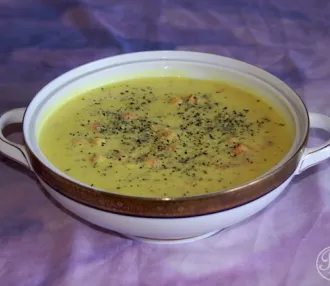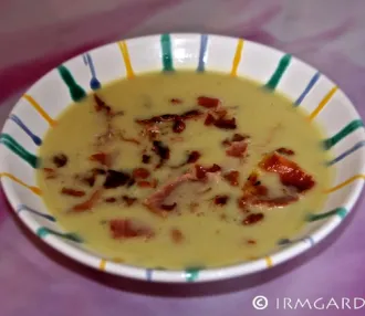 Erdäpfelsuppe mit Eierschwammerl und Speck