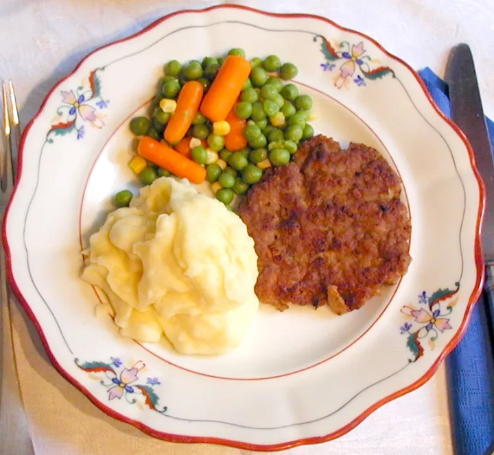 Zu den faschierten Laibchen paßt gut Kartoffelpüree und englisches Gemüse.