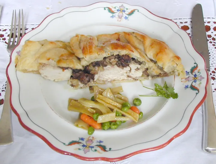 Die Hühnerbrust mit einem Faltschnitt aufklappen, vorsichtig klopfen, salzen und mit der Pilzmischung bestreichen. Die Brust wieder zusammenklappen und in den Blätterteig einrollen. Teig außen mit Ei besteichen, mit Backpapier auf ein Backblech geben und im vorgeheizten Rohr bei ca. 200°C 25 Minuten zu schöner goldbrauner Farbe backen.