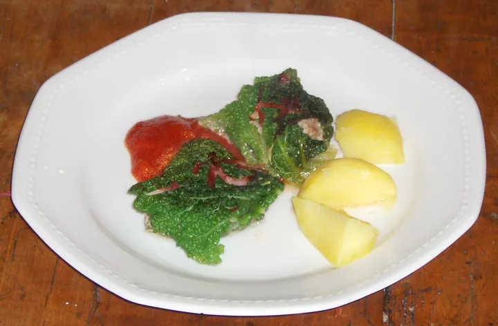 Kohlrouladen auf Paradeissauce anrichten. Mit Salzerdäpfeln servieren.