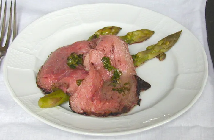 Den Lungenbraten in ganz dünne Scheiben schneiden, mit dem Spargel auf Tellern anrichten und die restliche Marinade über das Fleisch geben. Nocheinmal min. 5 Minuten ziehen lassen.