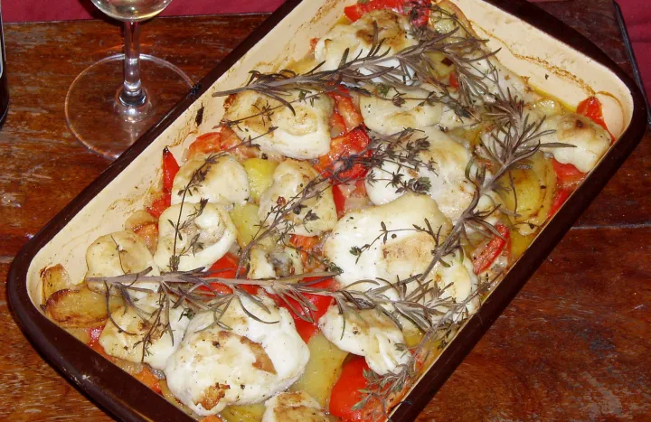 Die Zwiebel fein hacken, in einer feuerfesten Form in Olivenöl anschwitzen. Erdäpfel schälen und in Spalten geben, Paprika in ca. 2cm große Stücke schneiden, Knoblauchzehen schälen. Gemüse in die Form geben, kurz mitrösten.