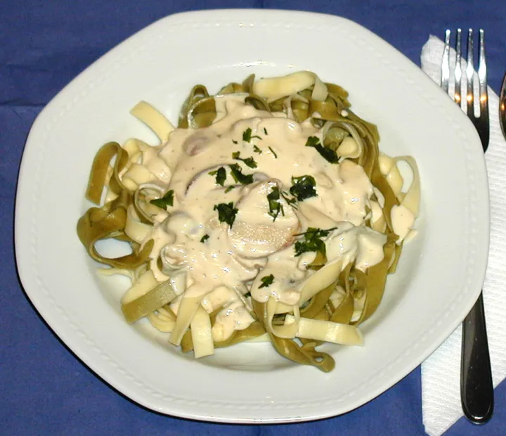 Nudeln in Salzwasser al dente kochen, abseihen und wenn nötig im Topf warm halten. Für die Sauce inzwischen Zwiebel fein würfeln, die Steinpile putzen und in Scheiben schneiden. Butter in einer tiefen Pfanne erhitzen, die Zwiebel beigeben, glasig dünsten. Nun die Pilze dazugeben und gut rösten. Die Creme fraiche und den Schlagobers beigeben und mit Salz, Pfeffer und der gehackten Petersilie würzen.