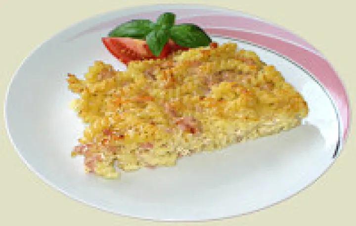 Nudeln in reichlich Salzwasser al dente kochen, abseihen und gut abtropfen lassen (oder Reste verwerten). Zwiebel schälen und fein hacken, Schinken in feine Streifen schneiden.