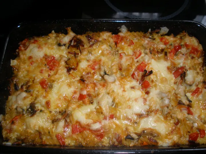 Die gekochten Nudeln mit dem Gemüse vermischen und in eine leicht gefettete Auflaufform geben.