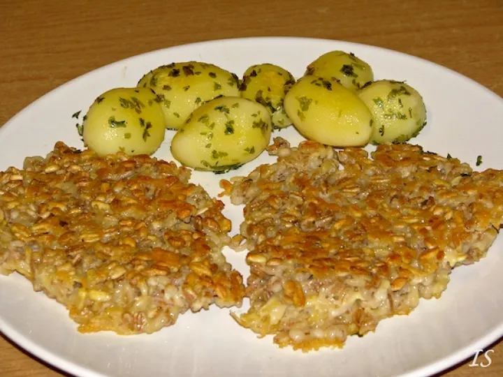 Laibchen formen und in einer beschichteten Pfanne ohne zusätzlich Fettzugabe goldbraun backen.