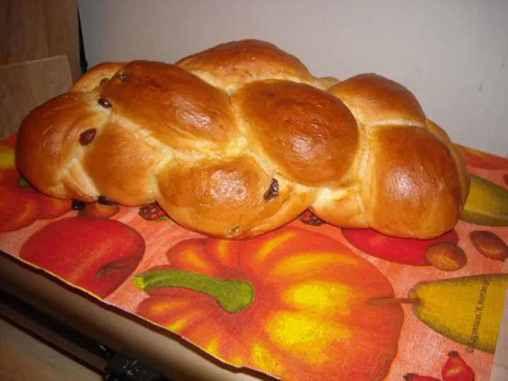 Mit 3 Rollen einen Zopf flechten, 2 miteinander verschlungene darübersetzen, oder einen 6 er flechten, ( ist schwieriger ) mit verquirltem Ei bestreichen, mit Hagelzucker oder Mandeln bestreuen und bei 200° C , ca. 30 Minuten backen.