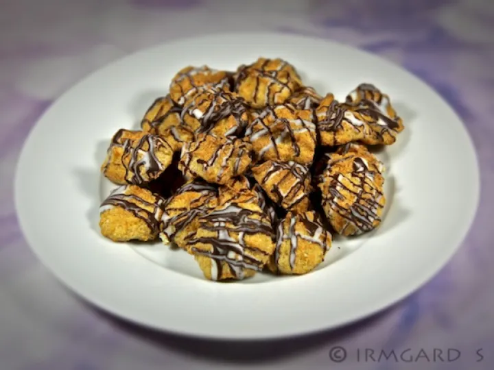 Kleine Häufchen (am besten mit einem Spritzsack) auf ein mit Backpapier belegtes Backblech setzen und im vorgeheizten Backofen bei 160° ca. 10 Minuten backen.