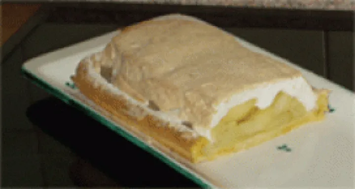 Den Teig auf der bemehlten Arbeitsfläche 4 mm-dick ausrollen und in je 10 cm-breite Streifen von einer ganzen und einer halben Backblechlänge schneiden; auf ein ungefettetes Backblech legen und aus dem restlichen Teig Stangerln formen; die beiden Teigstreifen an den Längsseiten mit Wasser bestreichen und die Teigstangerln so darauflegen, daß ein erhöhter Rand entsteht; die Teigböden mit einer Gabel mehrmals einstechen und bei 190 Grad 10-15 Minuten lichtbraun backen; auf dem Blech erkalten lassen und danach die Apfelfülle darauf verteilen. Die Eiklar mit dem Zucker zu sehr steifem Schnee schlagen, den man auf die Apfelfülle streicht und mit einer nassen Palette sorgfältig glättet; zuletzt die Oberfläche mit Staubzucker bestäuben. Den Kuchen sodann im vorgeheizten Backrohr bei 210 Grad noch einige Minuten überbacken, bis die Schneehaube eine leichte, gleichmäßige Bräunung aufweist; erkalten lassen und mit einem nassen Messer in Schnitten aufschneiden.