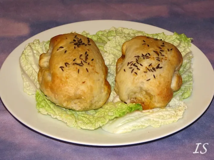 Diese Strreifen mit Der Thunfischmasse belegen, den Filoteig an den Seiten einschlagen, zu einem Päckchen zusammenlegen und bei 180° ca. 20 Minuten goldbraun backen.