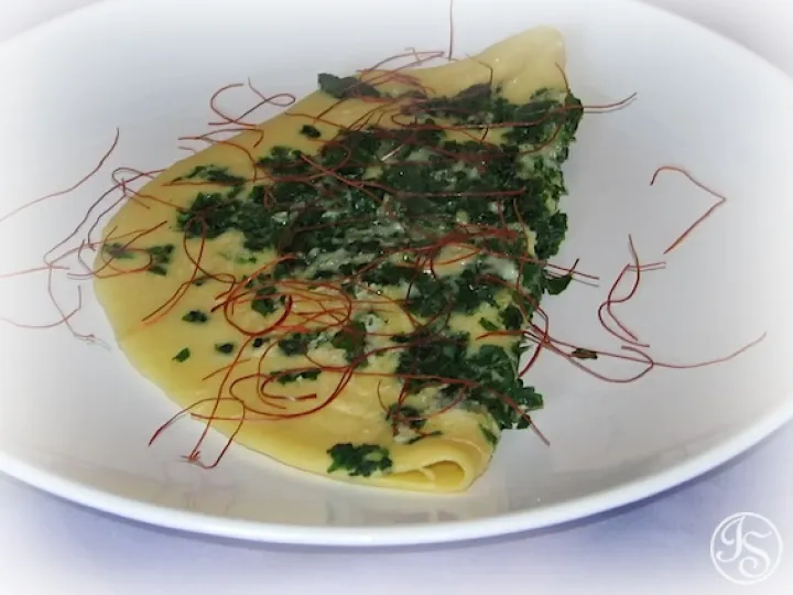 Das Omelette goldbraun backen und mit getrockneten Chilifäden servieren.