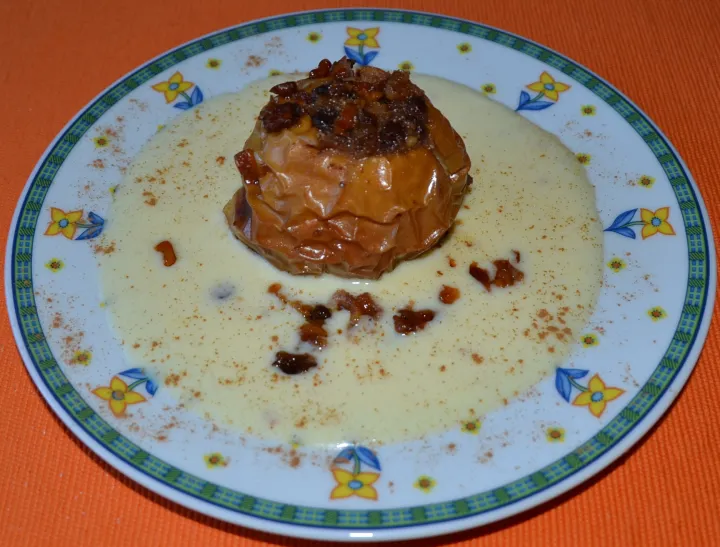 Vanillesoße auf Teller anrichten - den Bratapfel in die Mitte geben und servieren - guten Appetit.