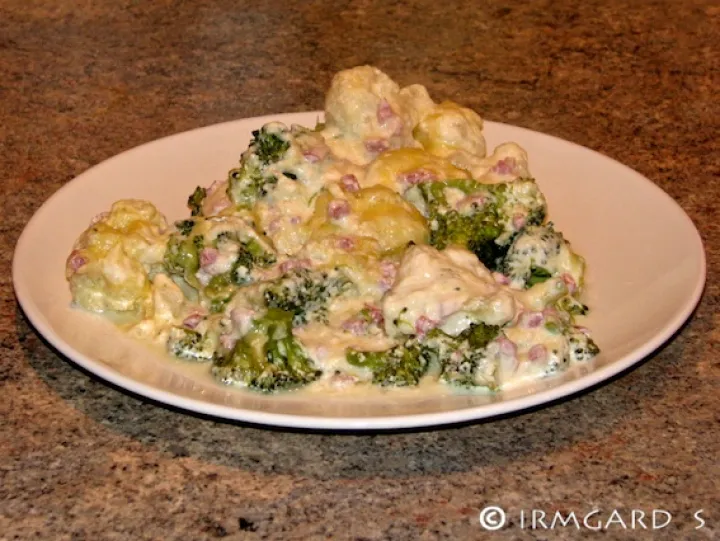 Den Brokkoli und den Karfiol zerteilen und im Dampfgarer bissfest garen. Mit Salz und Pfeffer würzen.