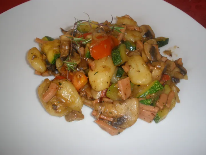 In einer großen Pfanne etwas Öl heiß werden lassen, das Gemüse nacheinander kross anbraten, den Leberkäse dazugeben und zum Schluss die Gnocci mit in die Pfanne geben. Hitze reduzieren und für einige Minuten ziehen lassen.