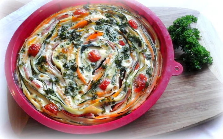 Zucchini, Möhren, Schinken und Kartoffel abwechselnd in die Form legen, so dass eine Spirale entsteht. Ich habe zuerst eine zusammengerollten Zucchinistreifen in die Mitte gelegt. Dann das restliche Gemüse im Wechsel von außen nach innen.