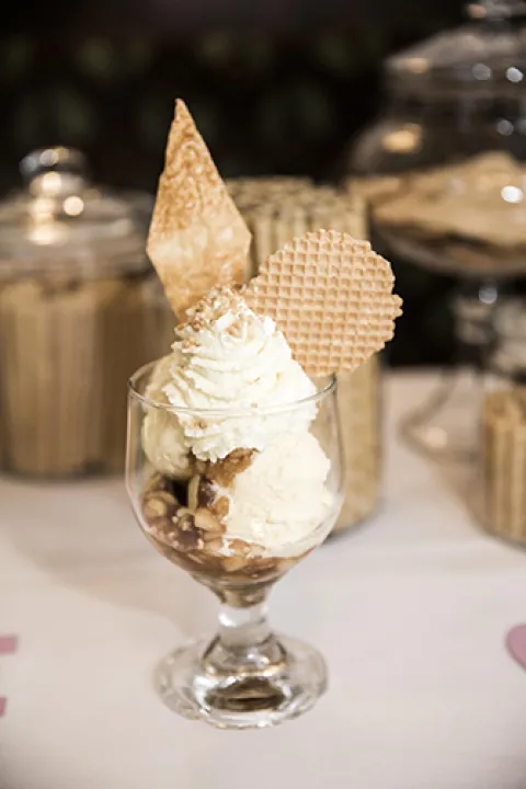 mit Krokant bestreuen. Obenauf den Auer Waffeltaler drapieren.