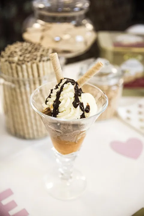 Je eine große Kugel Vanilleeis und Schokoladeneis daraufsetzen, mit den Sacher Würfeln bestreuen.