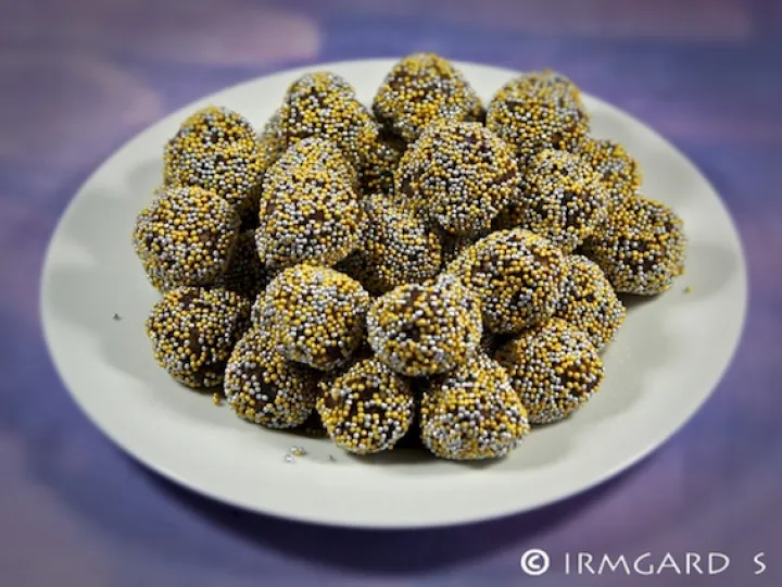 Kalt werden lassen und kleine Kugeln formen. Diese in Gold- und Silbernonpareilles wälzen.