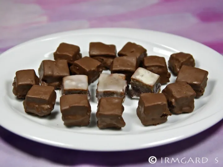 Auskühlen lassen und in Würfel schneiden. Jeden Würfel in die im Wasserbad geschmolzene Schokolade tauchen und auf einem Kuchengitter trocknen lassen.