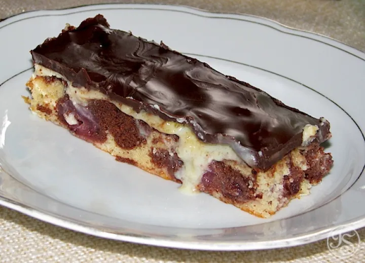 Das Blech mit Backpapier belegen und knapp zwei Drittel des Teiges auf das Blech streichen. Kakao und Milch unter den restlichen Teig rühren. Den dunklen Teig gleichmäßig auf den hellen Teig streichen. Die abgetropfen Kirschen darauf verteilen, leicht in den Teig drücken und im vorgeheizten Backrohr ca. 35 Minuten backen. Auskühlen lassen.