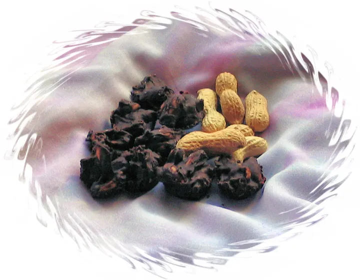 Die halbierten Erdnüsse in die geschmolzene Kuvertüre tauchen und kleine Häufchen in eine Pralinenform setzen.