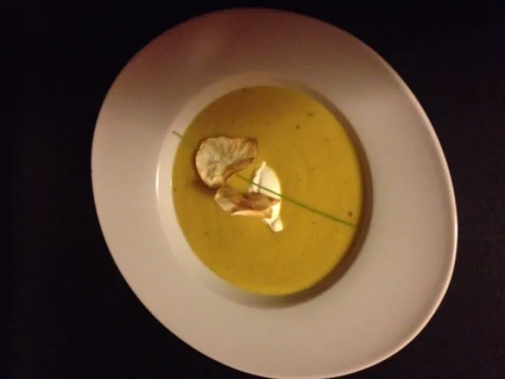 Den Sellerie schälen. Einen Teil davon mit der Brotmaschine in ganz dünne Scheiben schneiden. Den Rest würfeln. Die Schalotte ebenso würfeln und mit dem zerkleinerten Ingwer in der Butter anrösten. Dann die Selleriewürfel, den Curry und den Safran beimengen. Mit der Suppe und dem Apfelsaft ablöschen, würzen und alles weichkochen. Kurz vor dem Ende der Garzeit den klein gewürfelten Apfel hinzugeben und noch ein paar Minuten mit köcheln lassen. In der Zwischenzeit die Selleriescheiben im Öl knusprig backen und mit Küchenrolle abtupfen. Das Toastbrot in Wasser einweichen. Vor dem Pürieren der Suppe den Toast ausdrücken und mit der Creme fraich in die Suppe einrühren. Mit den Selleriechips und einem Tupfer Creme fraich servieren. Mahlzeit!