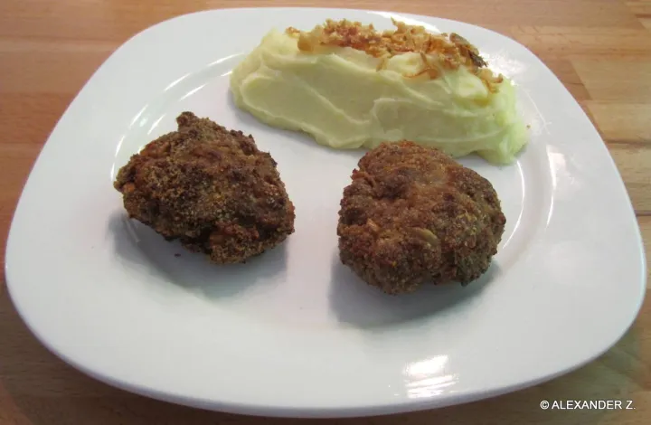 Das Knödelbrot in der Milch einweichen. Die restliche Zutaten mit dem Fleisch vermengen. Anschließend das ausgepreste Knödelbrot mit dem Fleisch zu einer festen Masse kneten. Dann ca. 15 Laibchen formen und in den Semmelbröseln wälzen. In einem Top das Öl erhitzen (ca 600 ml) und die Laibchen braun bis dunkelbraun herausbraten und auf einer Küchenrolle das überschüssige Öl abtropfen lassen.