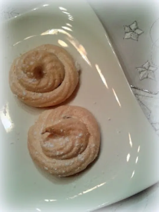 2 Eiweiß schnittfest schlagen, 1 Tl Zitrone und 100 g Zucker dazu geben, alles zu Schnee rühren.