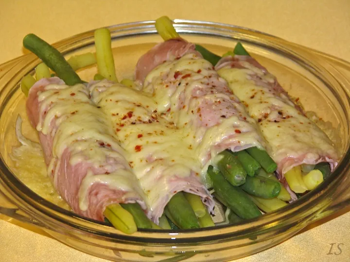 Jede Scheibe Schinken mit Senf bestreichen und mit Pfeffer, Salz und Chiligewürz bestreuen. Einige Fisolen auf das Schinkenblatt legen und reinrollen.
