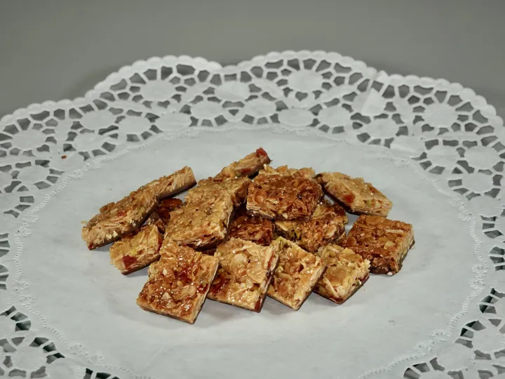 Etwas abkühlen lassen und in Quadrate schneiden.
