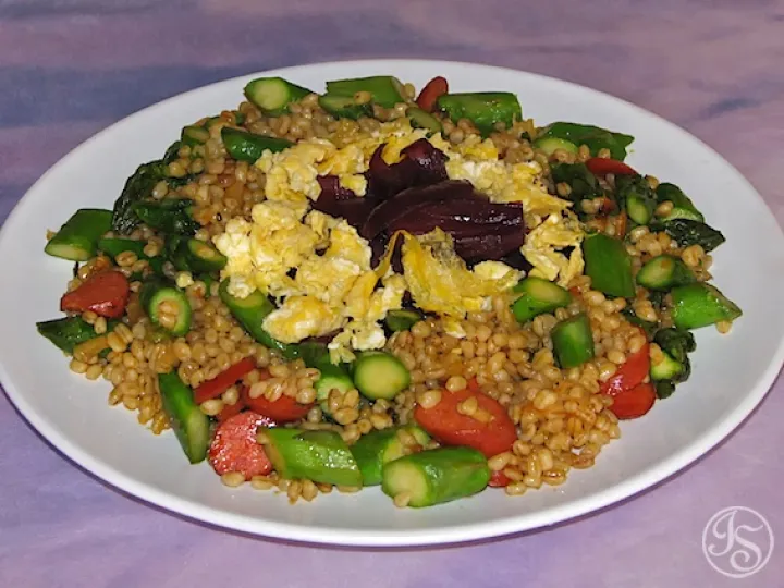 Das Olivenöl in einer Pfanne erhitzen und den Knoblauch darin kurz anrösten. Den Spargel dazugeben und mitrösten. Den Edelweizen und das Würstl dazugeben und alles ca. 10 Min. durchrösten bis der Spargel bissfest ist.