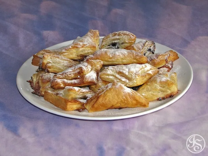 Butter, Mehl, Wasser, Rum, Salz und Dotter zu einmem Teig verkneten und rasten lassen. Messerdick ausrollen, mit einem Teigrad in 10 x 10 cm große Quadrate schneiden.