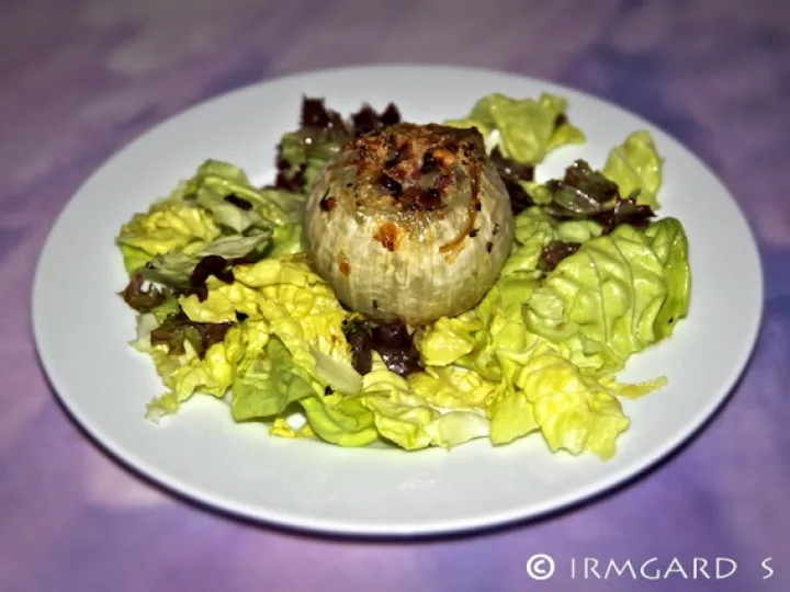 Die Zwiebeln schälen, oben je einen Deckel abschneiden. Das Brötchen in Wasser einweichen. Die Zwiebeln in kochendem Salzwasser blanchieren, bis die einzelnen Schichten sich leicht voneinander lösen lassen und sie dann soweit aushöhlen, dass die 3 äußeren Schichten stehenbleiben.