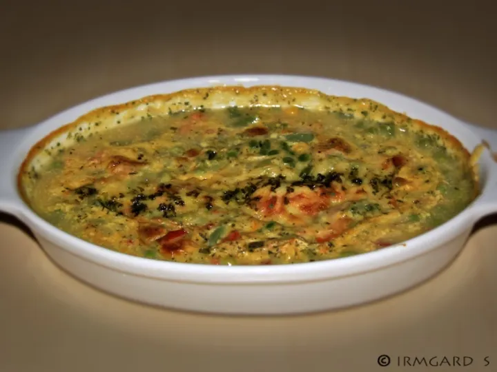 Das Gemüse darin verteilen und das Rahm-Eier-Gemisch darübergießen.