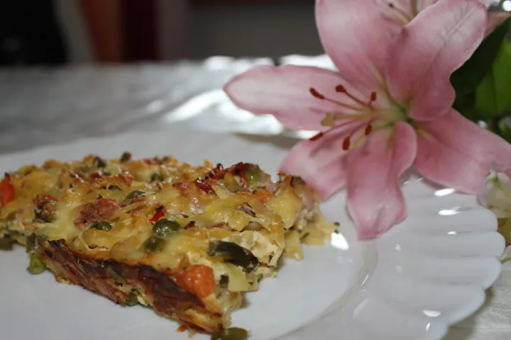 Spitzpaprika, Zwiebel, Karotte, Knoblauch, Erbsen und Bohnen in einer heissen Pfanne mit Öl einige Minuten dünsten, bis die Zwiebel glasig werden. Mit Petersilie würzen. Nudel dazugeben und alles zusammen verrühren. Eine feuerfeste Auflaufform reichlich und gründlich mit 20g Butter befetten und die Gemüsemasse gleichmässig darin verteilen.