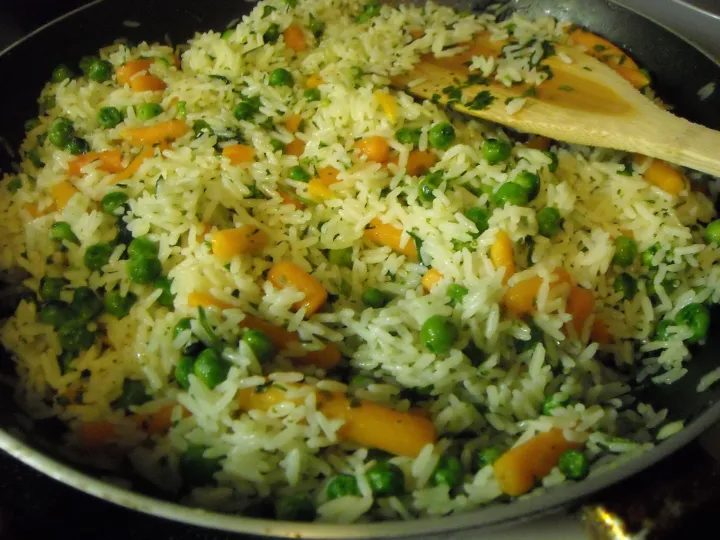 Den Reis in einer Tasse abmessen, zu den Karotten geben und glasig werden lassen, mit der doppeltem Menge heißem Wasser aufgießen, aufkochen lassen , mit Salz und Pfeffer würzen.