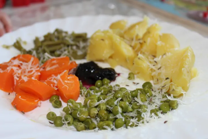 Alle Zutaten vorbereiten. Kartoffel, Karotten, Erbsen und Bohnen auf einen Teller servieren und mit Zitronensaft beträufeln, mit Salz und Kümmel würzen und mit geriebenen Emmentaler bestreuen. Einen Teelöffel Heidelbeermarmelade dazugeben und warm servieren.