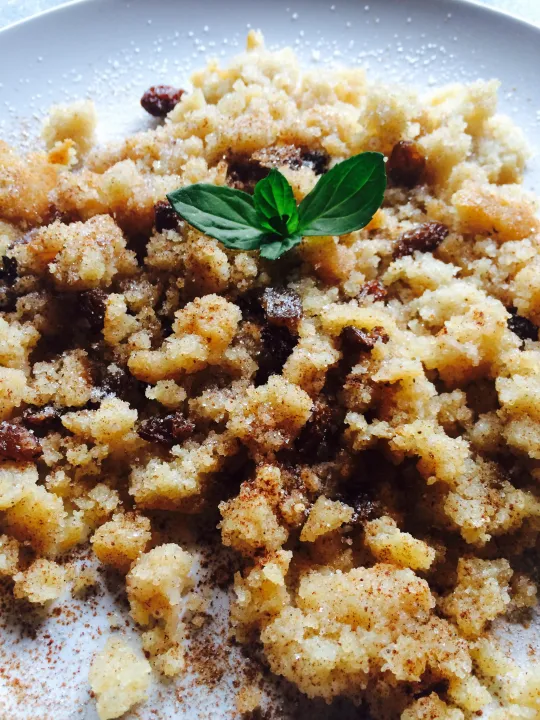 Zum Schluss die Rosinen untermengen und mit Umluft bei 170 Grad ein paar Minuten fertig backen. ( der Gries Schmarren soll schön krümelig und trocken sein!)