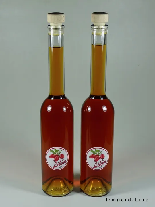 Nach dieser Zeit die Hagebuttenansatz durch ein feines Sieb abseihen. Zucker und Wasser in einem Topf aufkochen, dann etwas abkühlen lassen. Das Zuckerwasser mit abgeseihten Hagebuttenansatz vermischen und in saubere Flaschen füllen. Gut verschlossen aufbewahren.
