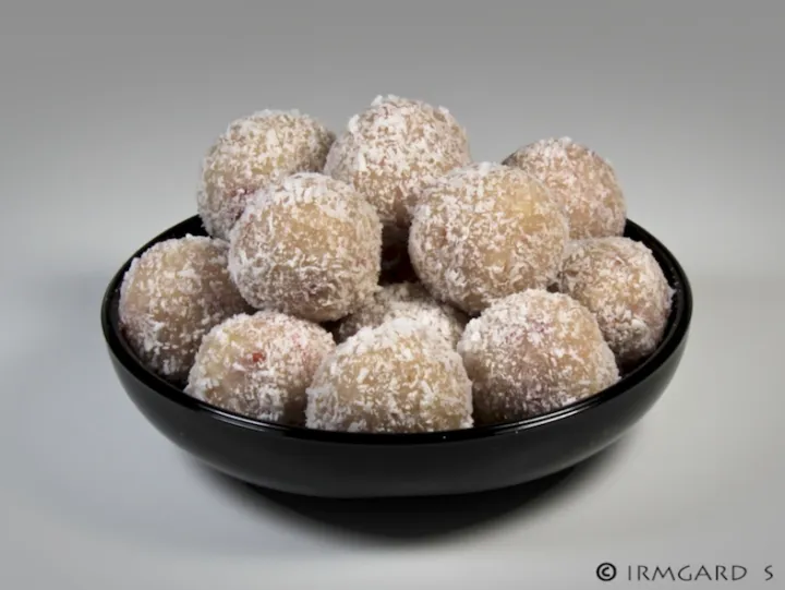 Die Masse kalt werden lassen und dann kleine Kugeln formen, diese dann in Kokosflocken wälzen und kühl und trocken lagern.