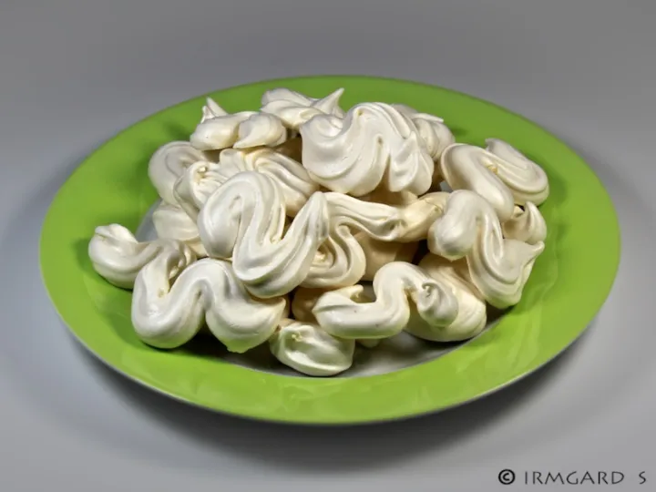 Nach fünf Minuten im Ofen die Temperatur auf 50° herunterstellen und die Baiser ca. 3 – 4 Stunden trocknen lassen.