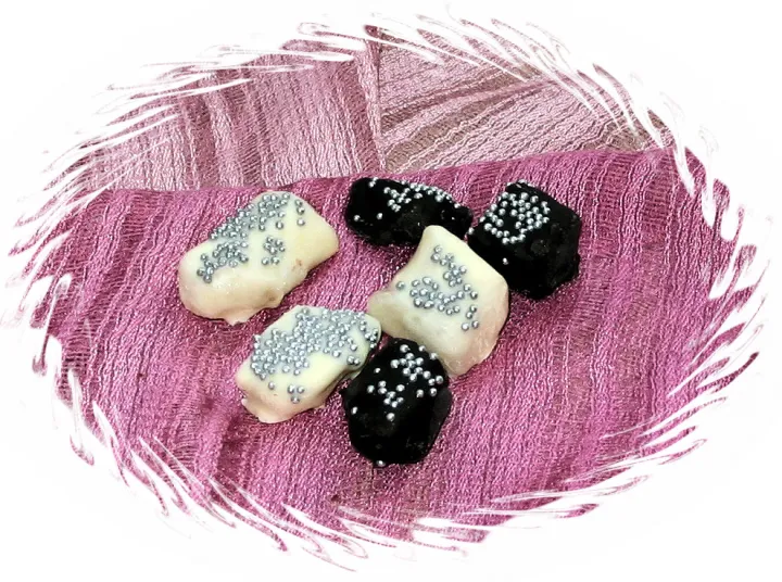 Die Schokoladen getrennt im Wasserbad schmelzen lassen und die Ingwerstücke in die Schokolade tauchen.